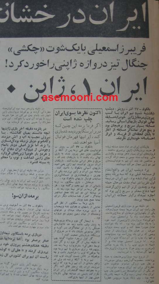 بانکوک- 27 آذر- رویترز: دیشب(یکشنبه شب) تیم ایران با کسب پیروزی در مقابل ژاپن خود را به مسابقه نهایی فوتبال بازی های آسیایی رسانید. مسابقه بسیار سریع و پرهیجان بود و پنج هزار تماشاگر مسابقه از آغاز تا پایان لحظه ای از فریاد و ابراز احساسات خودداری نکردند. بازیکنان ایران در تمام مدت مسابقه زیاده از حد بر بازیکنان ژاپنی برتری داشتند. فرورادهای ایران بسیار ماهر بودند و یک بازی عالی و جالب دسته جمعی و متحد ارائه کردند و مدافعین قد بلند آن تیم به فوتبالیست های تیزدو ژاپن مجال حرکت نمی دادند.برد دیشب ایران در واقع انتقام از مسابقه قبلی بود که سه بر یک به نفع ژاپن تمام شده بود. تیم ایران در نیمه اول تقریبا در تمام مدت در حال حمله بود و چندین کرنر از تیم ژاپن گرفت. تنها دفاع محکم و سریع ژاپن بود که اجازه نمی داد رگبار حملات ایرانیان به نتیجه برسد. در دقیقه سی و سوم بازی، فریبرز اسمعیلی بغل راست تیم ایران سریعا به سمت دروازه رفت. یکی از بک های ژاپن در مقابل او به دفاع برخاست. بک می خواست راه را بر اسمعیلی ببرد.