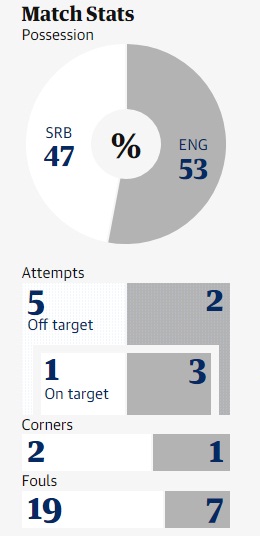 جود بلینگام با ضربه سری که در دقیقه سیزدهم روی سانتر بوکایو ساکا وارد دروازه صربستان کرد، سه امتیاز برای سه شیرها به ارمغان آورد. صربها عملکرد ضعیفی داشتند با این حال در دقایق پایانی فشاری که به روی دروازه حریف وارد آوردند، آنها را تا آستانه باز کردن دروازه انگلیس پیش برد. هری کین هم یک بار تیر دروازه صربها را لرزاند اما این ضربه نیز گل نشد تا انگلیس مسابقات یورو را با برد در شهر گلزن کیرشن آلمان آغاز کند. آمار و تصاویر منتخب این بازی را مشاهده می کنید.