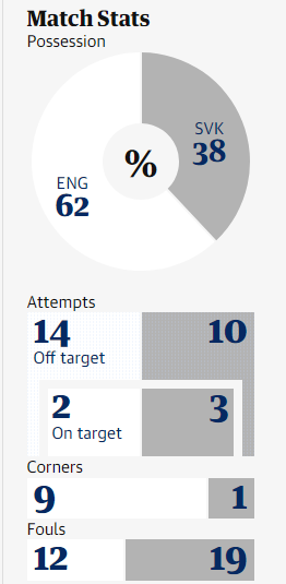 بد نیست بدانید انگلیس تاکنون در شش مسابقه با اسلواکی صاحب 5 برد و یک تساوی شده بود که تنها تساوی دو تیم نیز در یورو 2016 به دست آمده بود. اسلواکی می رفت که نخستین برد خود در برابر سه شیرها را ثبت کند که یکی دو دقیقه در انجام این حماسه کم آورد و انگلیس صاحب ششمین برد خود مقابل اسلواکی شد. آمار مسابقه دو تیم را مشاهده می کنید.