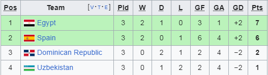 در روز سوم مصر با دو گل ابراهیم عادل(2-1) اسپانیا را شکست داد و صدر جدول را از لاروخا گرفت تا اسپانیا در دور بعد حریف ژاپن شود. ازبکستان و دومینیکن هم(1-1) مساوی شدند.