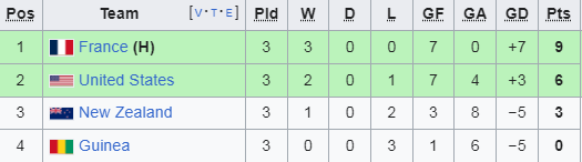 در روز سوم در این رقابتها فرانسه 3 گل به نیوزیلند زد و آمریکا هم 3 گل به گینه تا فرانسه با 9 امتیاز در صدر جدول گروه بایستد.