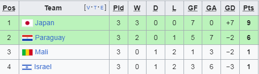 اسرائیل در روز دوم هم با دو گلی که در دقایق3+90 و 6+90 از پاراگوئه دریافت کرد (4-2) شکست خورد و با توجه به شکست(1-0) مالی از ژاپن و تقابل اسرائیل با ژاپن در روز پایانی، می توان اسرائیل را نیز حذف شده در نظر گرفت. با این حال همه تیمهای گروه در روز سوم روی کاغذ شانس صعود دارند.