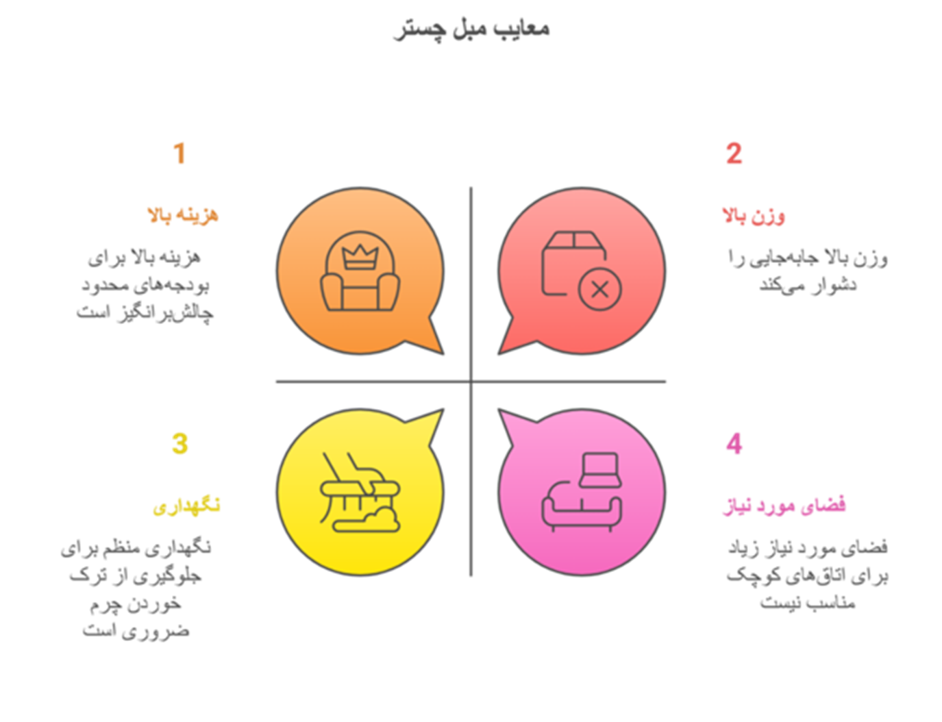 با وجود جذابیتهای بسیار، معایب مبل چستر را نمیتوان نادیده گرفت. این مبل، با وجود زیبایی، محدودیتهایی دارد که باید پیش از خرید در نظر گرفته شوند:
